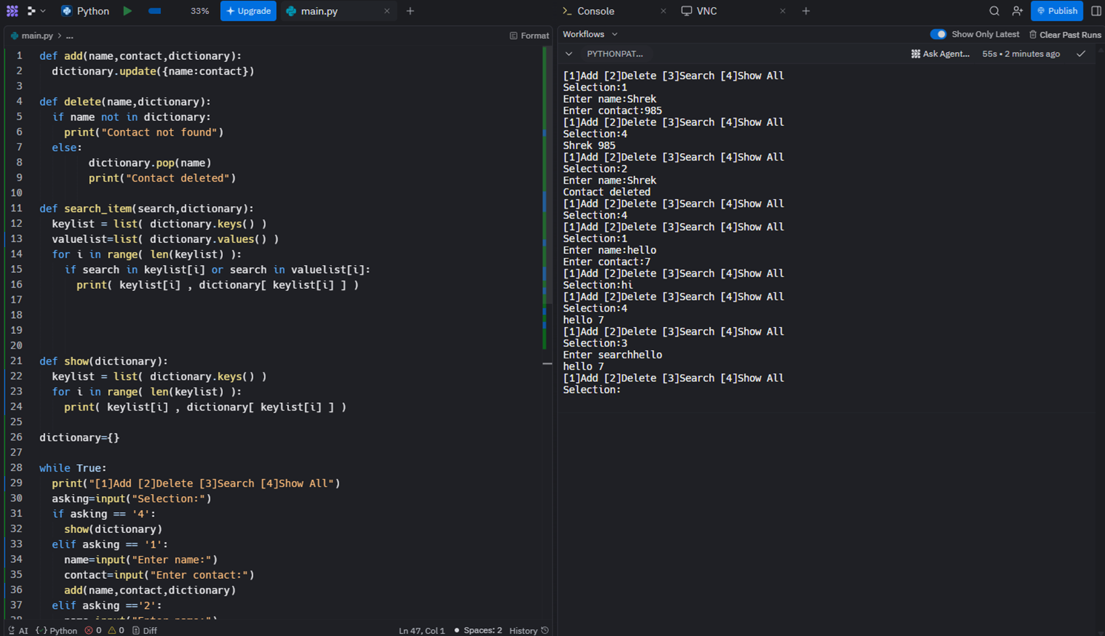 Contact List is a program that stores contacts along with their phone numbers. It allows users to add, delete, search, and display all saved contacts. When adding a contact, the program prompts the user to enter a name and the associated phone number. When deleting a contact, the user is asked to enter either the name or phone number of the contact they wish to remove. When searching, the user can input a name or phone number to find a specific contact. The “Show All” feature displays all saved contacts in the list.