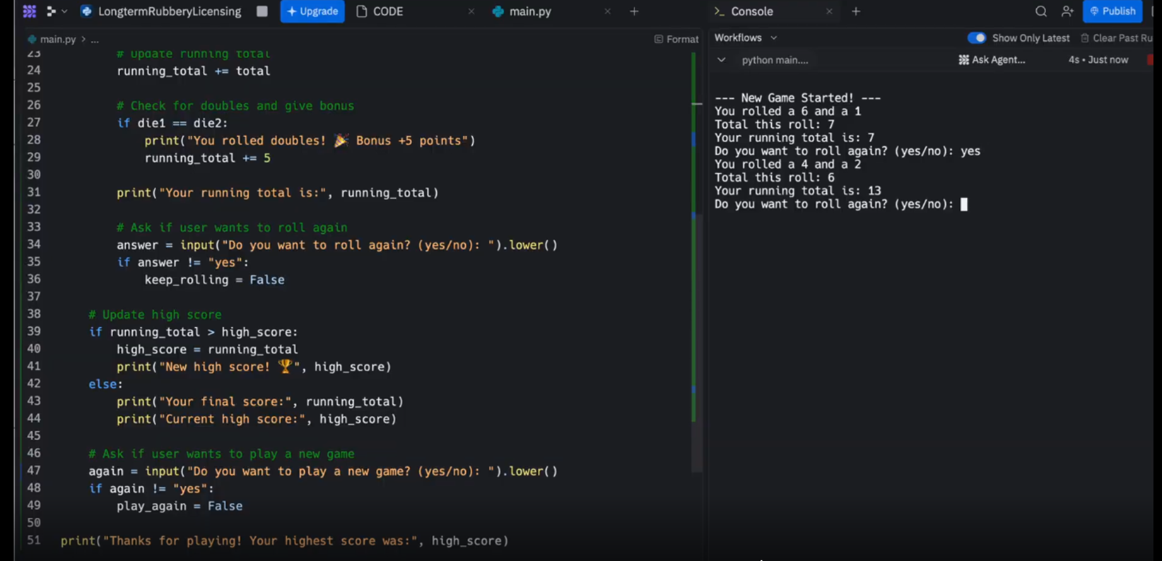 I have created a Python game named random_rolls.py that generates two random numbers between 1–6 and adds them to a running total. The program tracks high scores across multiple games and uses interactive prompts to let the player decide whether to keep rolling or start a new round.
