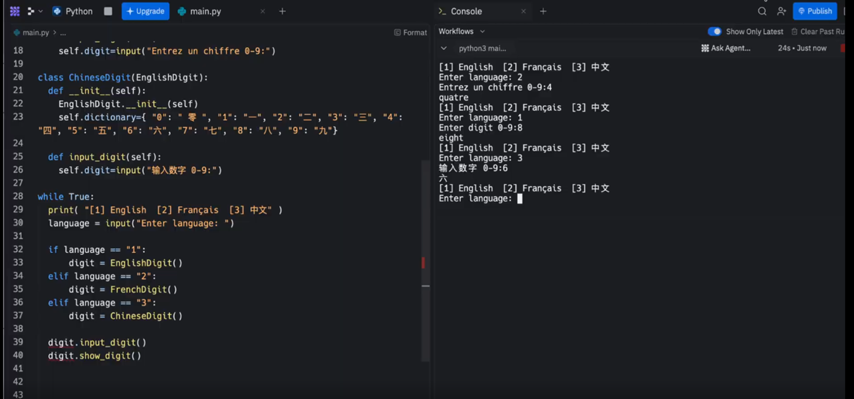 The program uses Object-Oriented Programming (OOP) to act as a multilingual translator. The user picks a language, which triggers the creation of a specific class object. A key-value map instantly translates the numeric input (e.g., "2") into a word (e.g., "二"). The program uses a while True loop to allow for multiple translations in one session.