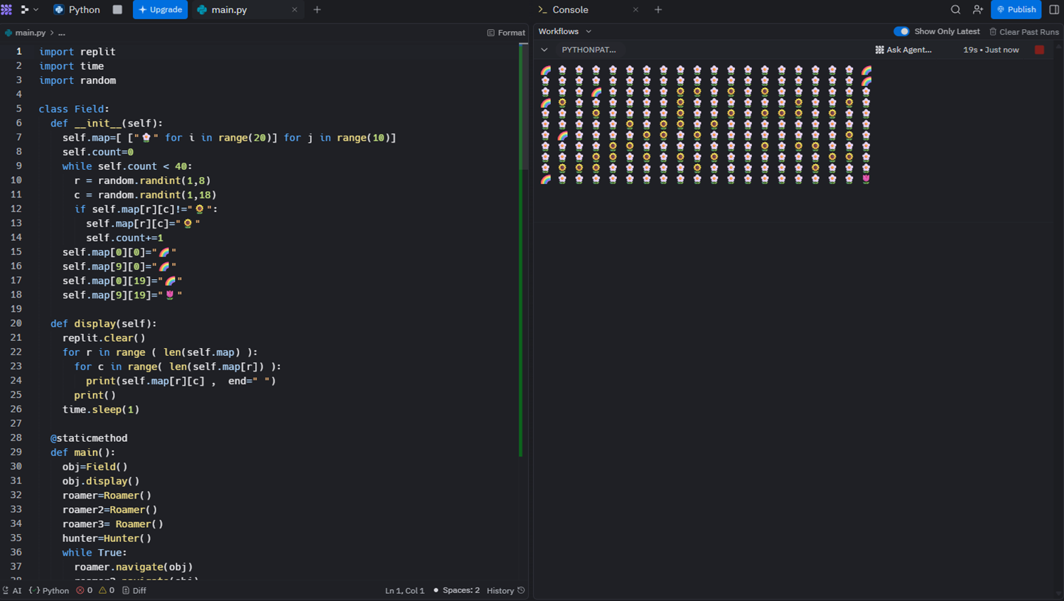 I have created a Python game that simulates a high-stakes "cat and mouse" chase on a 2D grid. The game features multiple "Roamers" trying to evade a single "Hunter" while navigating a field filled with obstacles. Field Initialization: A 10x20 grid populated with flowers (🌼) acting as open paths and sunflowers (🌻) acting as "dead end" obstacles that Roamers cannot pass through.
