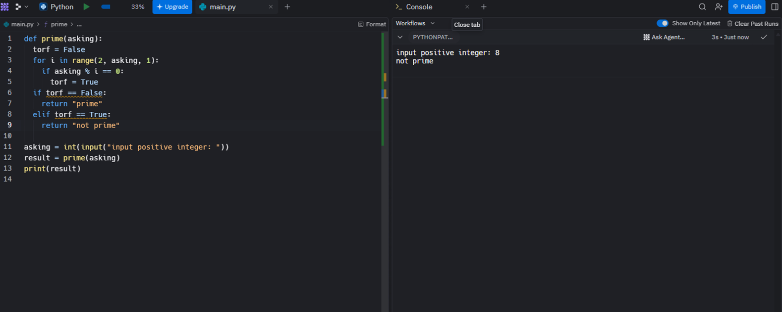 Prime Number Detector is a program that determines whether an input number is prime or not. It uses an if-else statement to check if the number can be divided evenly by any number other than 1 and itself. If the number can be divided by another number, the program prints “Not Prime.” If it cannot be divided evenly by any other number, the program prints “Prime.”