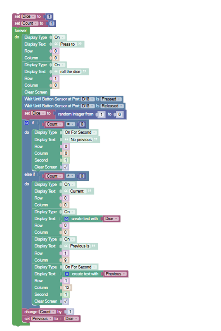 This program simulates a dice roll using a button input. It continuously displays instructions prompting the user to press a button to roll the dice. When the button is pressed and released, a random number between 1 and 6 is generated. On the first roll, it displays that there is no previous value. On subsequent rolls, it shows both the current dice value and the previous roll. A counter keeps track of how many times the dice has been rolled. After each roll, the current value is saved as the previous value for the next round.