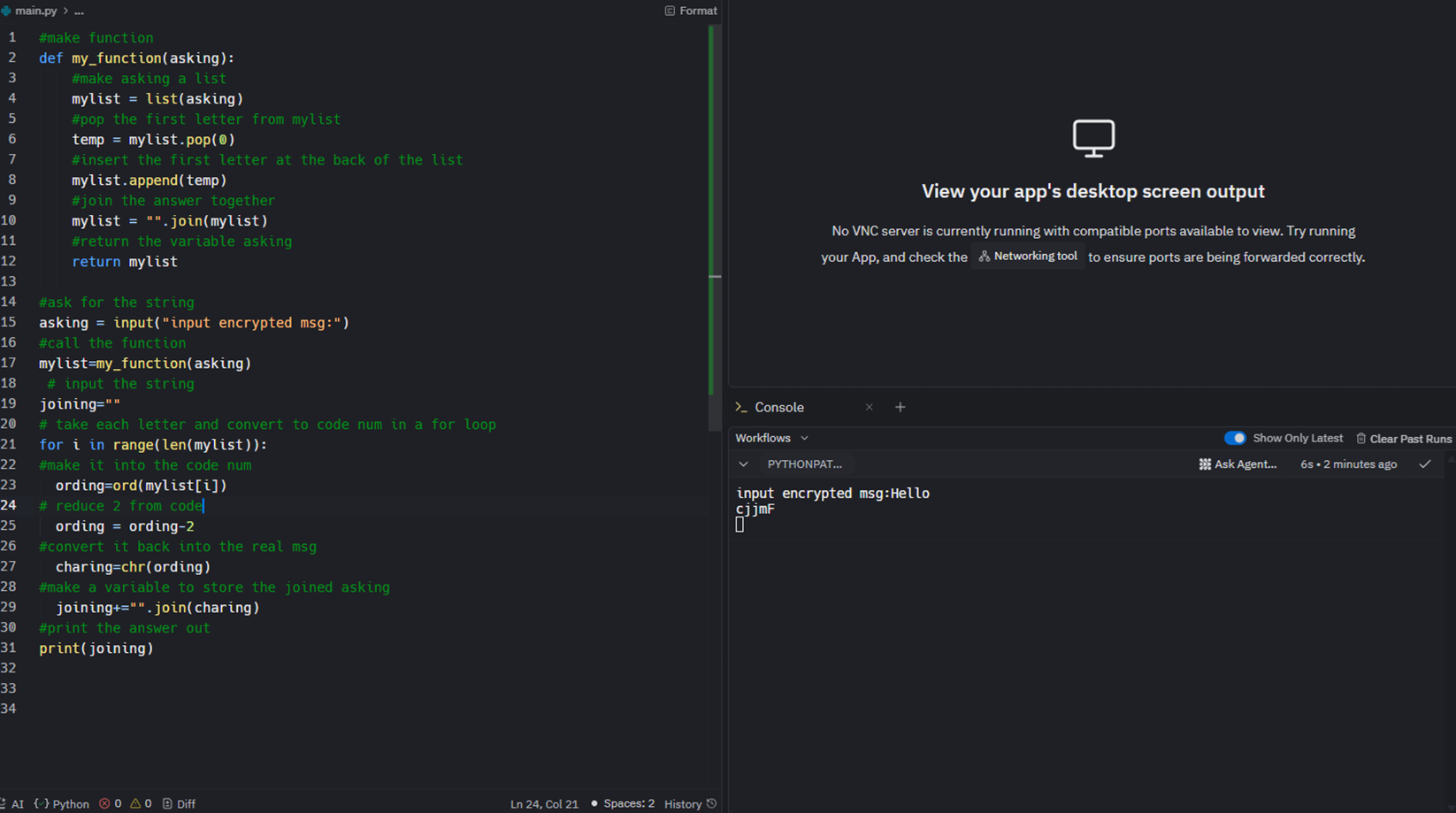 Encryption is a process in which an input message is converted into an encoded form to protect its meaning. In this program, I used ord() to convert characters into their numeric (ASCII) values, and chr() to convert those numeric values back into characters, creating the encrypted message.