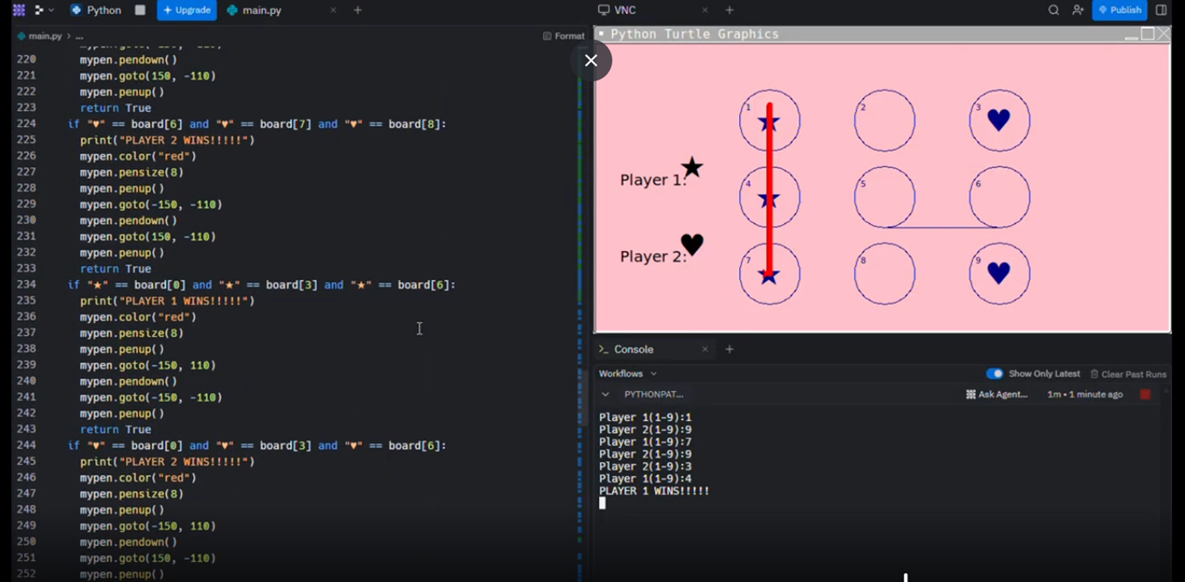 Tic-Tac-Toe is a game I designed using Python’s Turtle module, which allows graphics and drawings to be created using a virtual “turtle” that moves around the screen. The program draws nine circles to represent the game grid and prompts Player 1 to choose a number from 1 to 9. After a move is made, Player 2 is prompted to select a number, and the program draws either a star or a heart in the chosen circle. If a player selects a number that has already been used, the same player is asked to choose again. The program continuously checks for three symbols in a row to determine a winner and displays whether Player 1 or Player 2 has won. If no player achieves three in a row, the game ends in a tie.
